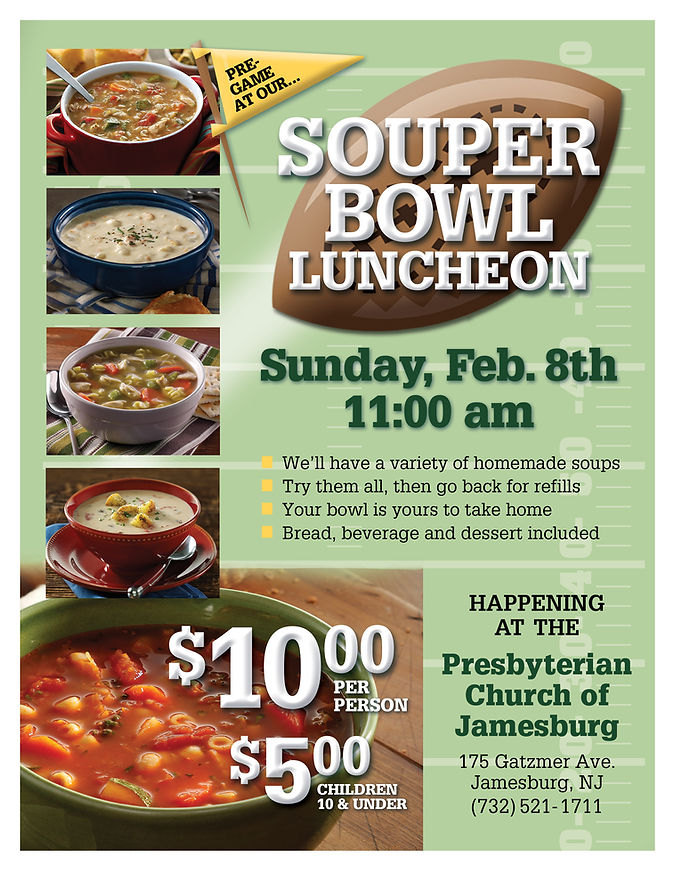 Warm up before the big game at our Souper Bowl luncheon. A wonderful selection of soups to choose from, try them all and the bowl is yours to take home!